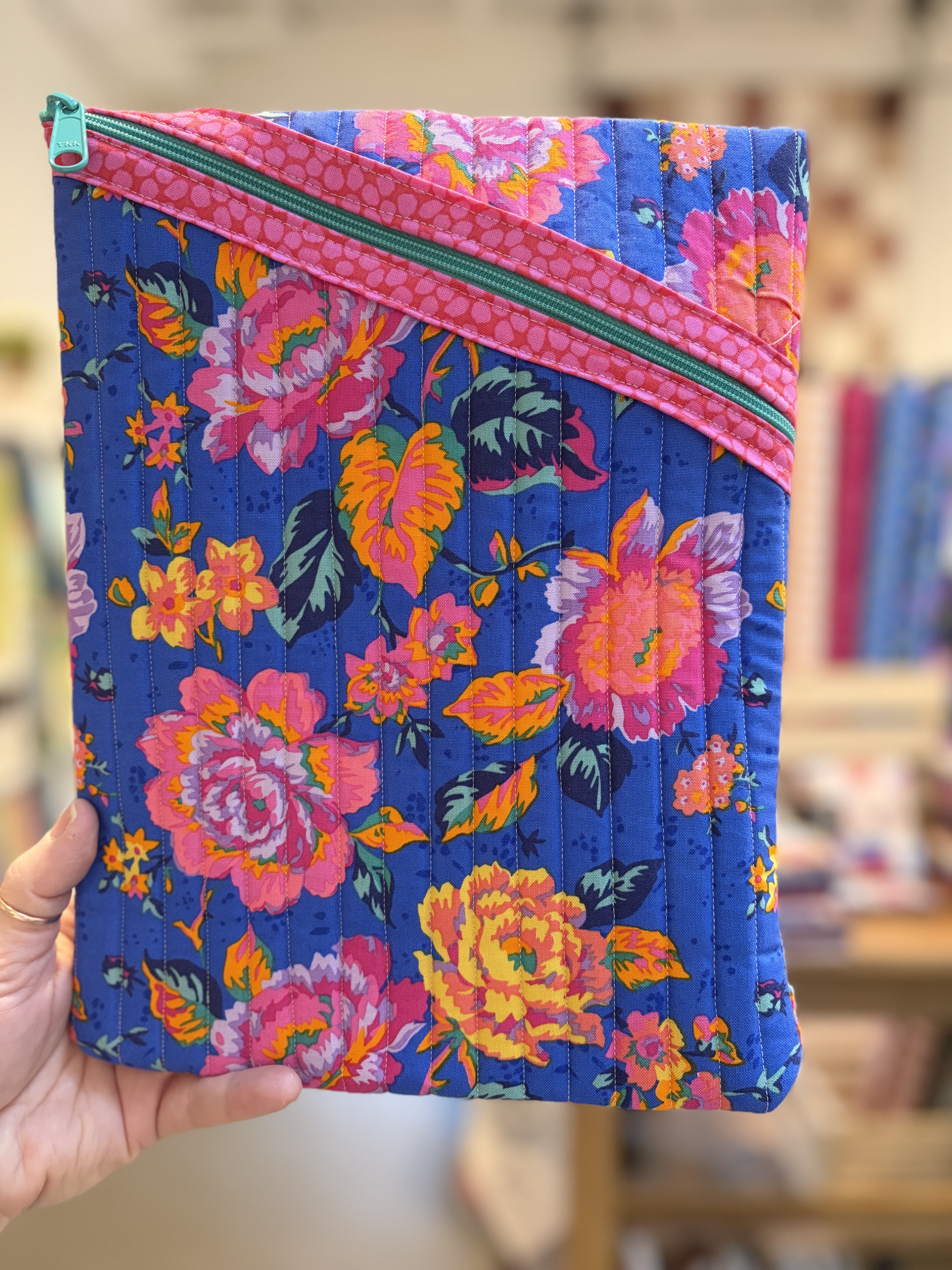 In our first Modern Makers Club you'll make a Hemingway Pouch to use for books, e-readers and more. In this class you'll complete the large size pouch practicing quilting, zippers and binding.